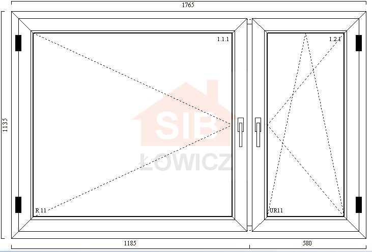 Podział okna: 1185 mm / 580 mm, słupek stały